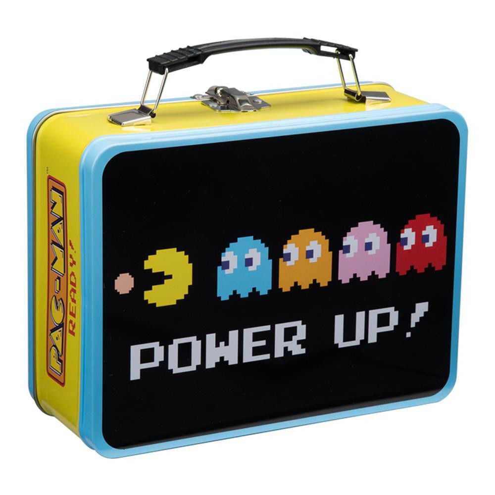 Pac-Man Large Tin Tote: Power up your lunch! Whether holding your lunch or storing your gear, this fabulous Pac-Man Large Tin Tote is a must for the super-fan or collector. The bold and bright design features the familiar Pac-Man screen on top, with Pac-Man, Pinky, and other characters on the bottom with the words 'Power Up!' Measuring 9-inches wide x 7 1/2-inches tall x 3 1/2-inches deep, the metal tote boasts metal latch closure and a collapsible plastic handle. Ages 13 and up.