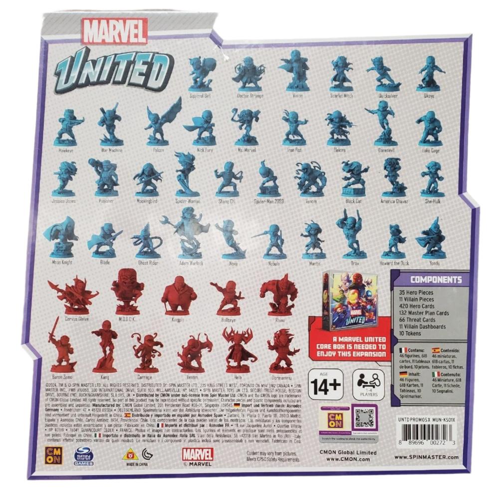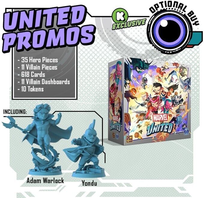 The Marvel United: Kickstarter Exclusive Promo Box - 2024 Edition is the Kickstarter Exclusive box containing all of the Stretch Goals from the original Marvel United campaign (except for Ant-Man and Wasp, which are in the original core box). This box also comes with Yondu and Adam Warlock, which were originally bundled with the Infinity and Ultimate Pledges, for a total of 46 Game Pieces.