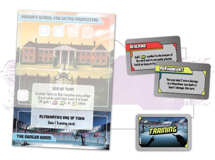 -Men: First Class is a Kickstarter Exclusive expansion that brings the first appearance of the X-Men to life! Go back to the first days of Xavier’s School for Gifted Youngsters and play with the original incarnation of these iconic Heroes and Villains. These characters not only have game pieces that reflect their classic looks, but also their game mechanics reflect a less experienced and more “raw” version of them. The Maximoff twins, Scarlet Witch and Quicksilver, form a unique villainous duo, working together to bring down the Heroes. And finally, the set of Locations contained in this expansion also bring the Danger Room, a special Location attachment that gives Heroes access to special Training!