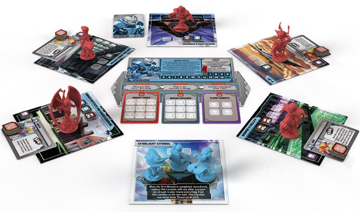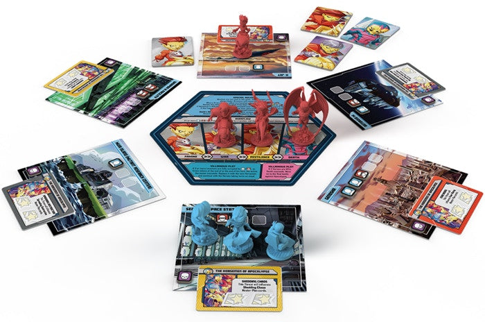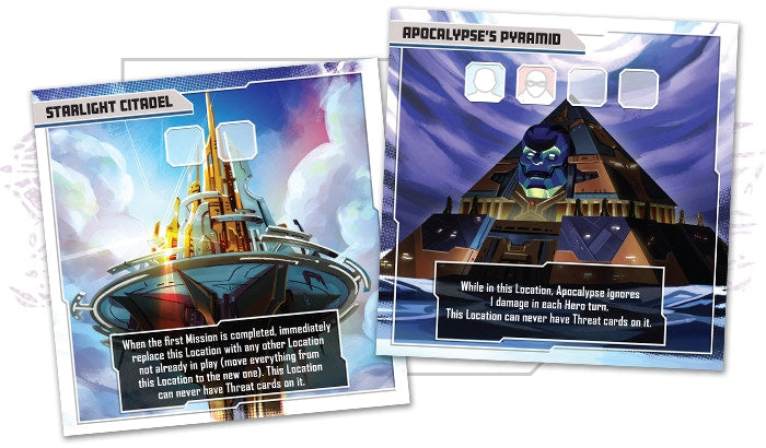 Players can choose to face Apocalypse directly, in a daunting game where the Four Horsemen are his Threats, but with their character pieces present on the play area and moving around the Locations to sow destruction. If they want the ultimate challenge, however, players can use the Four Horsemen Mode, where the battle against Apocalypse is preceded by a game against just the Four Horsemen. They will have to face each Horseman, one by one, each with a reduced Master Plan deck and their own set of rules and challenges. By being victorious, players will be able to take extra Action tokens to the final battle against Apocalypse. However, each Horseman that succeeds will be a more powerful Threat in the final game.
