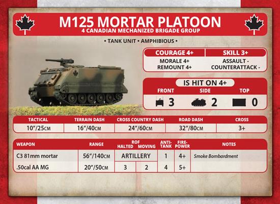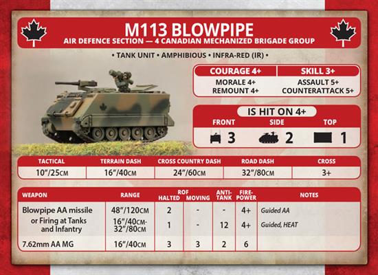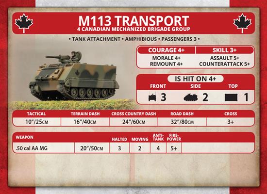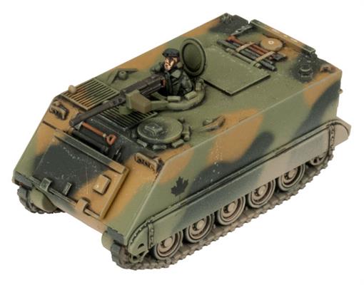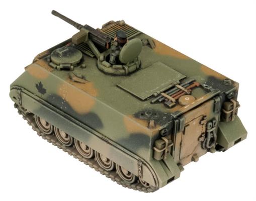 Includes five plastic M113 APCs, one plastic Tank Commander sprue, four M125 Mortar Crew, 3 M150 TOW crew, 3 M113 Blowpipe Crew, one Decal sheet, and five Unit cards.