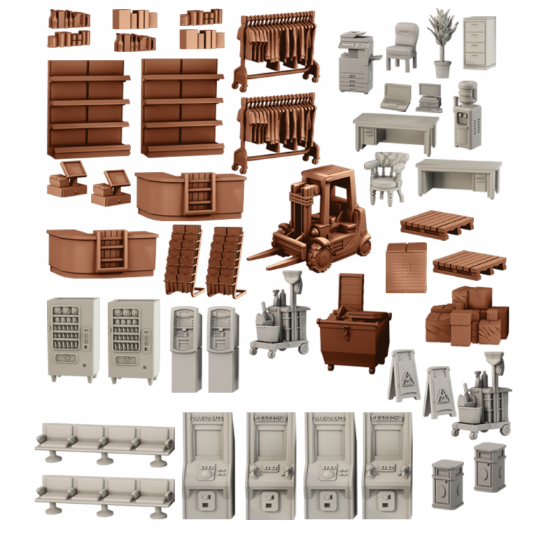 The sprawling urban areas of cities play host to many stories and conflicts. From deserted post-apocalyptic ruins to contemporary criminal skirmishes in, this set you’ll find the furnishings for offices, warehouses, shops, and malls. A huge variety of pieces to fill any built-up area!