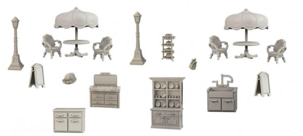 This set contains 17 pieces of scenery for a Cafe. The scale is 28-30mm, making them perfect for many modern and historical games. The pieces are cast in high quality plastic and are preassembled, ready to play straight out of the box.